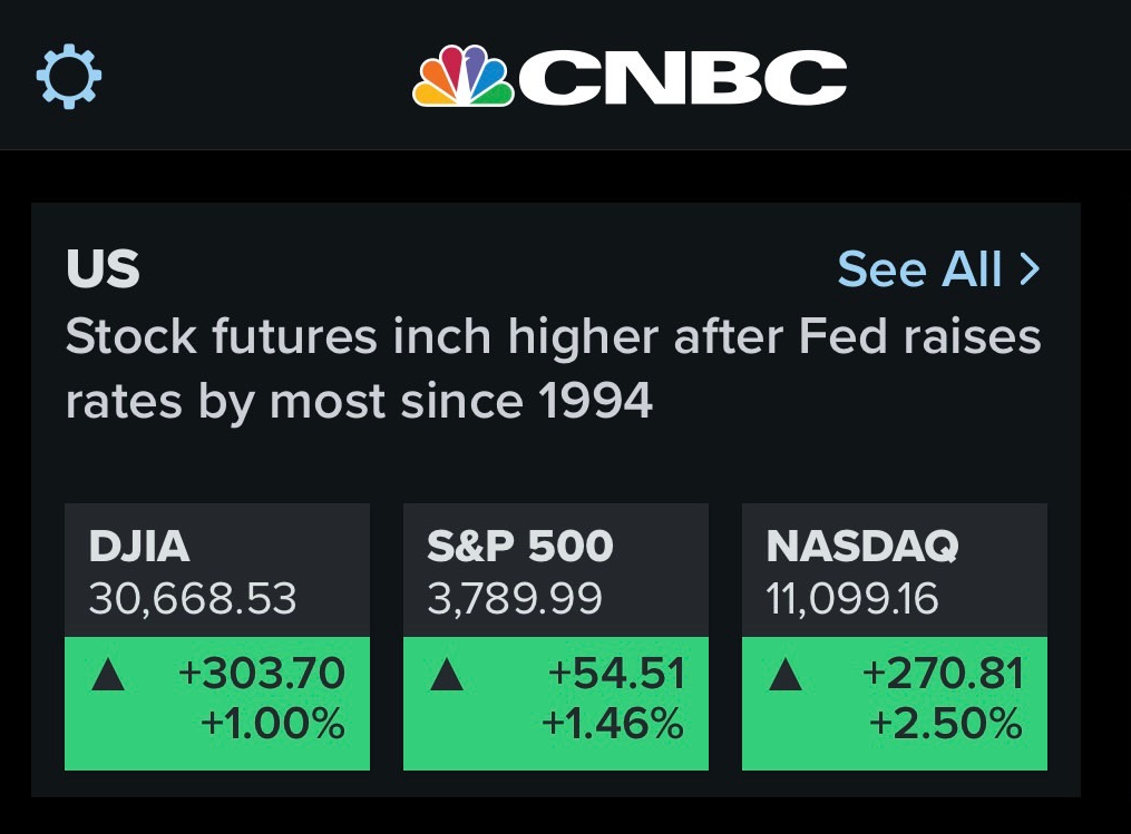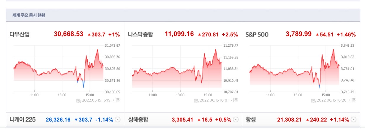 연준이 당초 약속했던 50bp를 넘어 선 75bp를 올리며 인플레를 잡겠다는 강한 의지도 보이고, 이런 차원으로 7월에도 75bp 인상이 가능하다고 표명한 것이 증시에 안도감을 제공했다는 평이 지배적입니다.